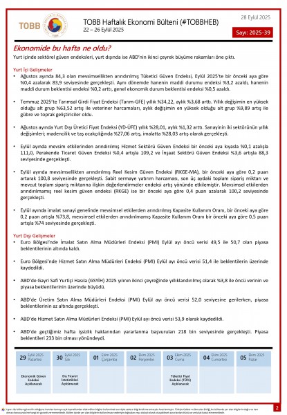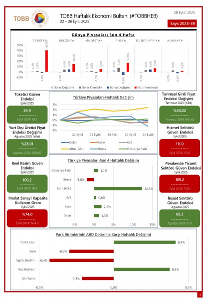 22-26 Eylül tarihleri arasında Türkiye ve dünya ekonomisinde yaşanan güncel gelişmelerin yer aldığı TOBB Haftalık Ekonomi Bülteni (#TOBBHEB) üyelerimizin bilgisine sunulmuştur.