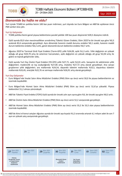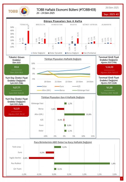20 – 24 Ekim tarihleri arasında Türkiye ve dünya ekonomisinde yaşanan güncel gelişmelerin yer aldığı TOBB Haftalık Ekonomi Bülteni (#TOBBHEB) üyelerimizin bilgisine sunulmuştur.