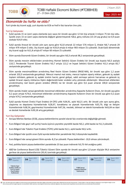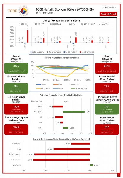 27 – 31 Ekim tarihleri arasında Türkiye ve dünya ekonomisinde yaşanan güncel gelişmelerin yer aldığı TOBB Haftalık Ekonomi Bülteni (#TOBBHEB) üyelerimizin bilgisine sunulmuştur.