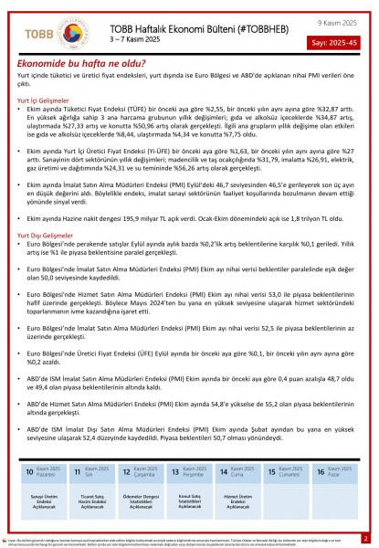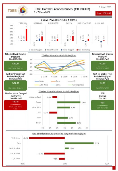 3 – 7 Kasım tarihleri arasında Türkiye ve dünya ekonomisinde yaşanan güncel gelişmelerin yer aldığı TOBB Haftalık Ekonomi Bülteni (#TOBBHEB) üyelerimizin bilgisine sunulmuştur.