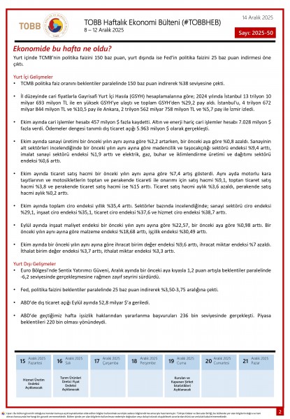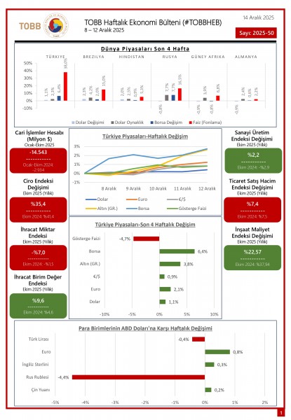 8 - 12 Aralık tarihleri arasında Türkiye ve dünya ekonomisinde yaşanan güncel gelişmelerin yer aldığı TOBB Haftalık Ekonomi Bülteni (#TOBBHEB) üyelerimizin bilgisine sunulmuştur.