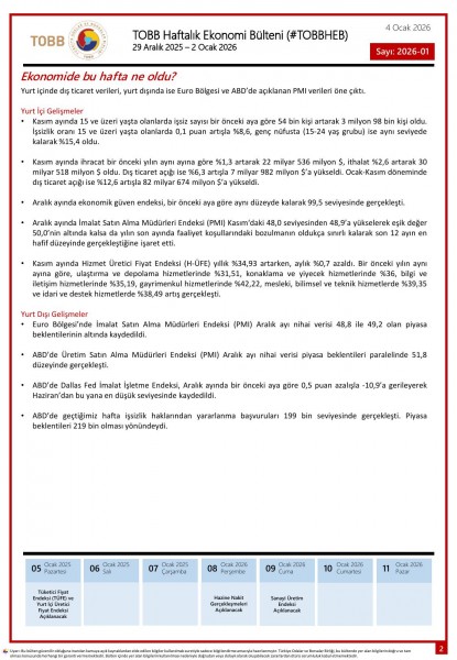 29 Aralık - 2 Ocak tarihleri arasında Türkiye ve dünya ekonomisinde yaşanan güncel gelişmelerin yer aldığı TOBB Haftalık Ekonomi Bülteni (#TOBBHEB) üyelerimizin bilgisine sunulmuştur.
