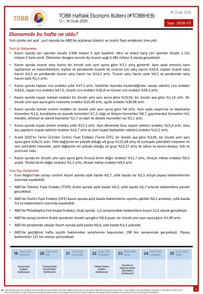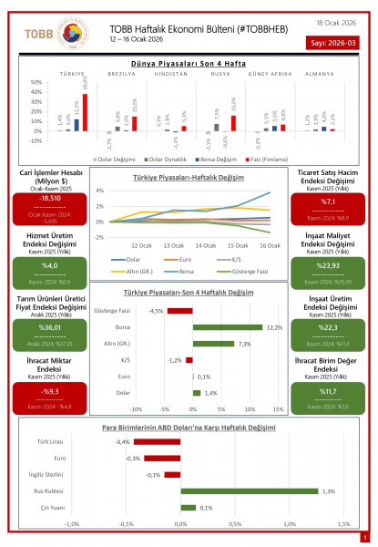 12 - 16 Ocak tarihleri arasında Türkiye ve dünya ekonomisinde yaşanan güncel gelişmelerin yer aldığı TOBB Haftalık Ekonomi Bülteni (#TOBBHEB) üyelerimizin bilgisine sunulmuştur.