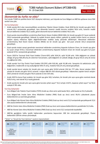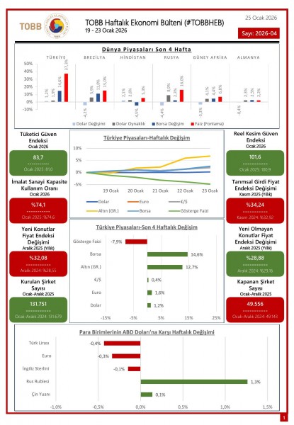 19 - 23 Ocak tarihleri arasında Türkiye ve dünya ekonomisinde yaşanan güncel gelişmelerin yer aldığı TOBB Haftalık Ekonomi Bülteni (#TOBBHEB) üyelerimizin bilgisine sunulmuştur.