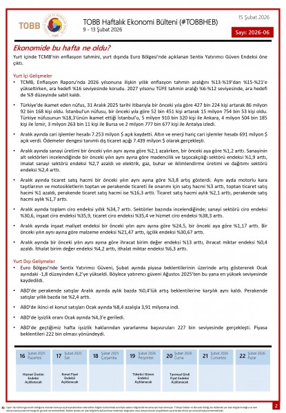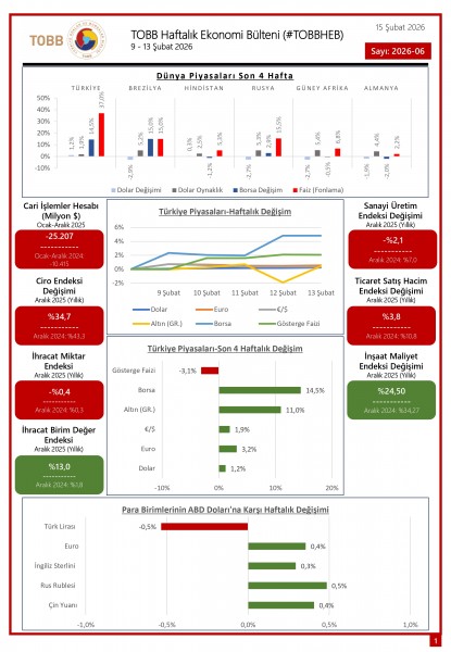 9 - 13 Şubat tarihleri arasında Türkiye ve dünya ekonomisinde yaşanan güncel gelişmelerin yer aldığı TOBB Haftalık Ekonomi Bülteni (#TOBBHEB) üyelerimizin bilgisine sunulmuştur.