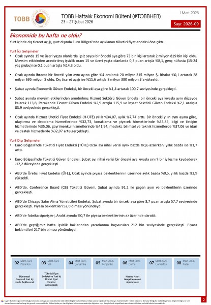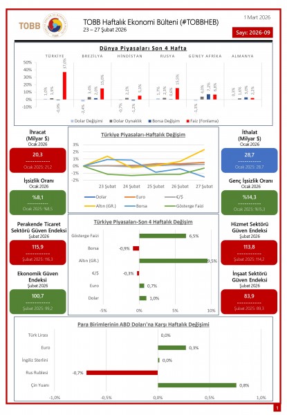 23-27 Şubat tarihleri arasında Türkiye ve dünya ekonomisinde yaşanan güncel gelişmelerin yer aldığı TOBB Haftalık Ekonomi Bülteni (#TOBBHEB) üyelerimizin bilgisine sunulmuştur.