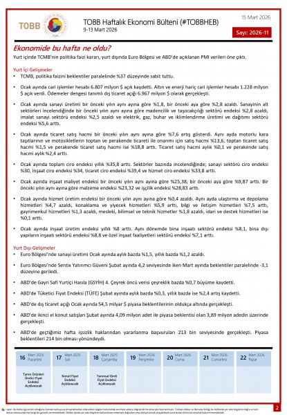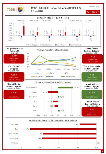 9-13 Mart tarihleri arasında Türkiye ve dünya ekonomisinde yaşanan güncel gelişmelerin yer aldığı TOBB Haftalık Ekonomi Bülteni (#TOBBHEB) üyelerimizin bilgisine sunulmuştur.