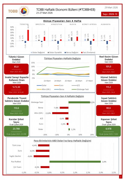 23-27 Mart tarihleri arasında Türkiye ve dünya ekonomisinde yaşanan güncel gelişmelerin yer aldığı TOBB Haftalık Ekonomi Bülteni (#TOBBHEB) üyelerimizin bilgisine sunulmuştur.